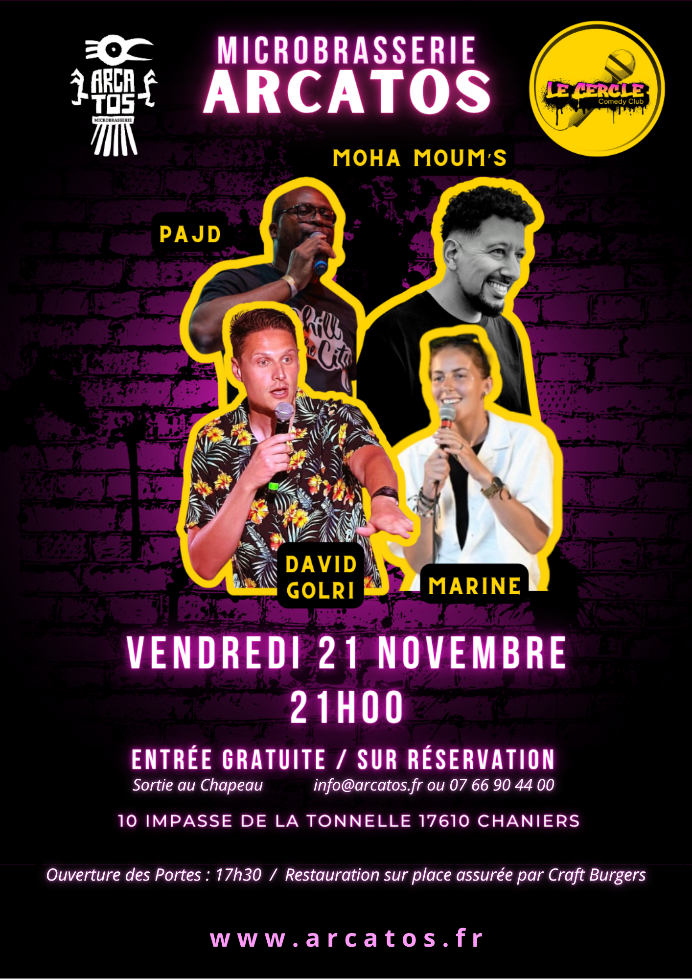 Nous accueillerons David Golri, PAJD, Marine et Moha Moum’s. Ce dernier est de retour sur scène avec de nouveaux sketchs exclusifs ! (Oui, il était là le mois dernier, mais il revient avec du neuf 😉)